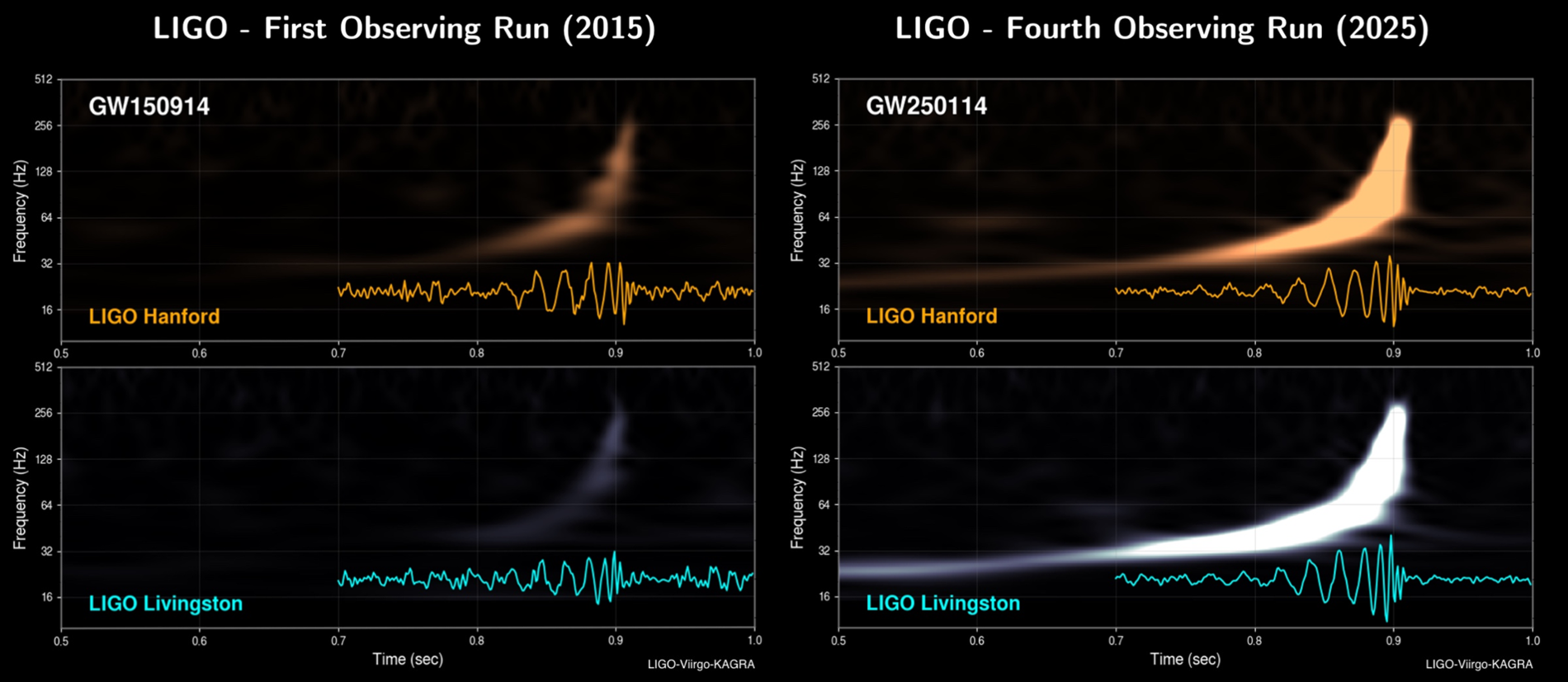 La sensibilitat millorada del LIGO s’exemplifica en el descobriment recent d’una fusió de forats negres anomenada GW250114. L’esdeveniment, captat el 14 de gener de 2025, no era gaire diferent de la primera detecció del LIGO, GW150914: totes dues implicaven forats negres d’uns 30 a 40 cops la massa del Sol i a uns 1.300 milions d’anys llum de distància. Però gràcies als 10 anys d’avenços tecnològics i reducció del soroll instrumental, el senyal del GW250114 és espectacularment més clar.
